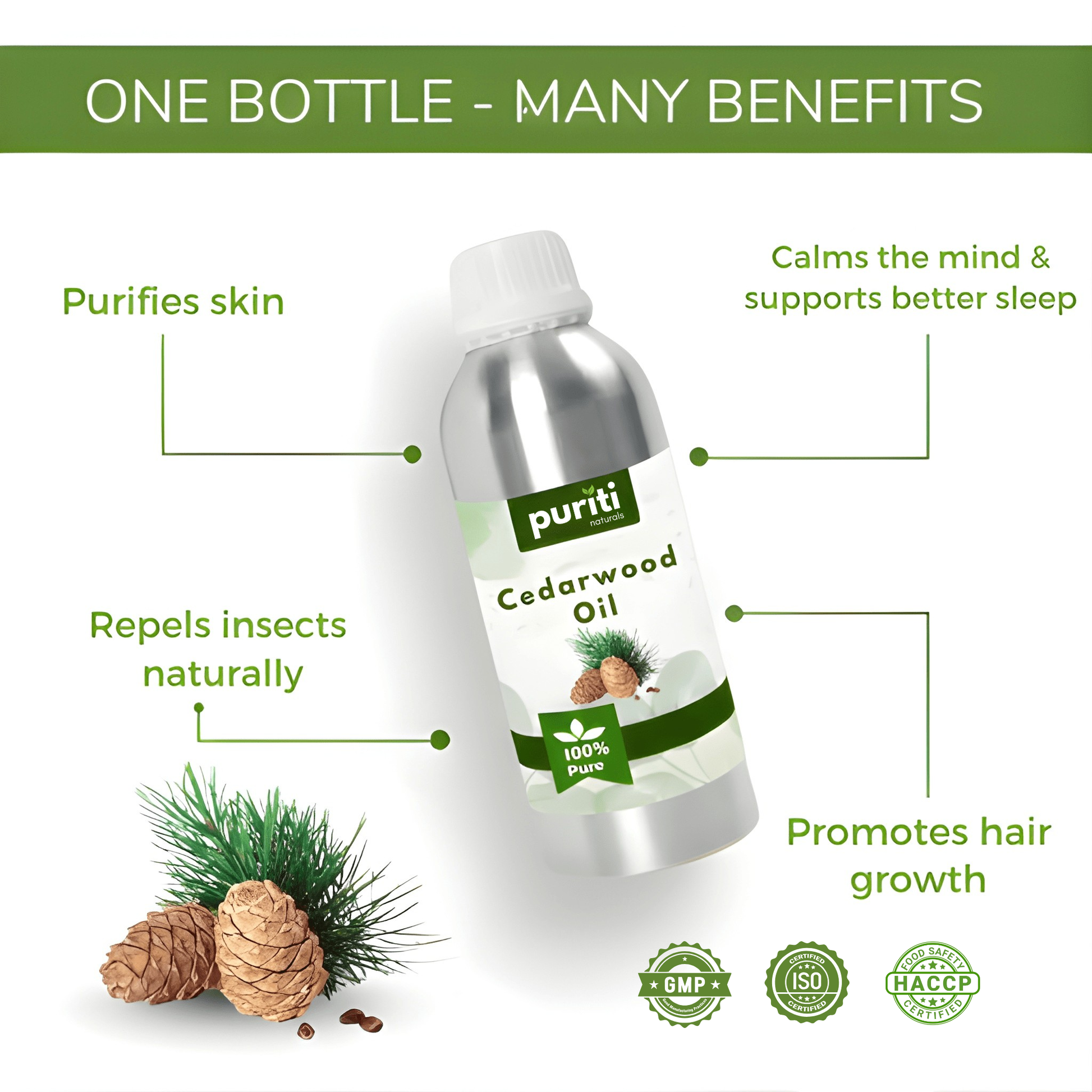 Embrace the natural strength and calming benefits of Puriti Naturals Cedarwood Essential Oil—the perfect essential oil for relaxation, skin purification, and hair nourishment.