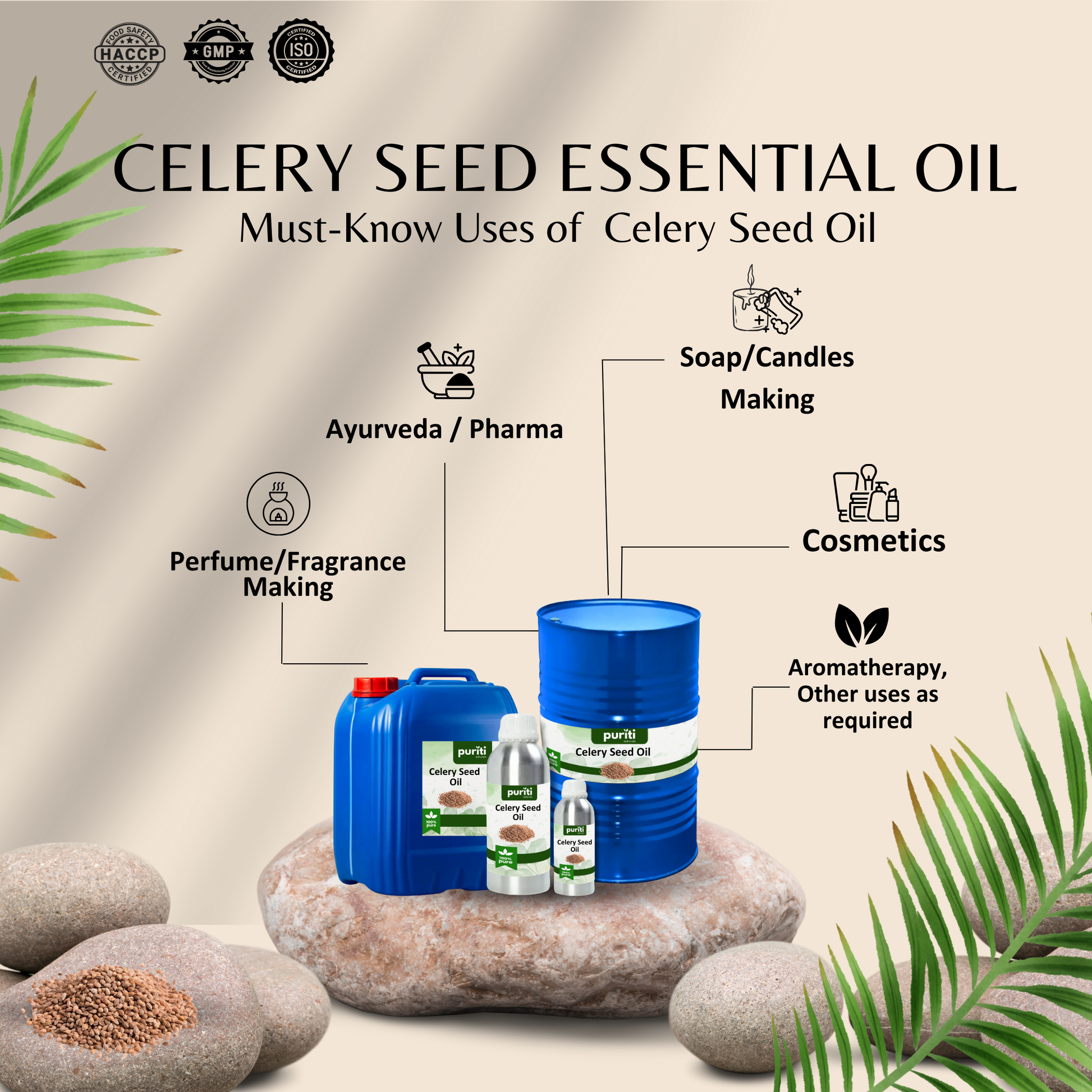 | Celery Seed Oil Blends with | Black pepper, coriander, ginger, and lavender essential oils. |